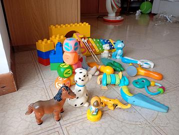 Sono 16 pezzi di costruzioni grandi, ben tenute e lo stesso vale per i pupazzi alcuni di pezza alcuni di plastica dura e sonanti.