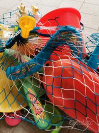 Gruppo di giochi per la spiaggia, compresi secchialli, palette, forme per la sabbia, 3 boomerang, barchette giocattolo ecc..