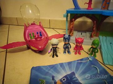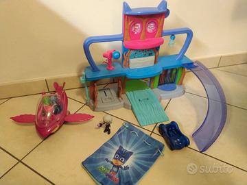 Superpigiamini: Quartier Generale + 4 personaggi braccia e gambe mobili (Superpigiamini + Lunetta) + Elicottero Gufetta (3 posti, ali mobili con pulsante, luci + audio) + auto Gattoboy