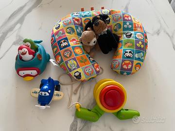 Giochi vari per bambini, pinguini e barca per bagnerto, gioco in legno da trascinare, peluche e aereo transformer