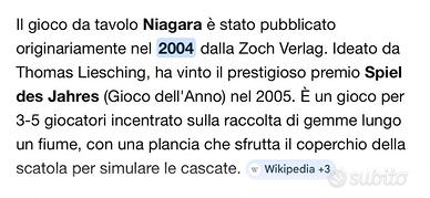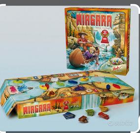 Descrizione Il gioco da tavolo Niagara è stato pubblicato originariamente nel 2004 dalla Zoch Verlag. Ideato da Thomas Liesching, ha vinto il prestigioso premio Spiel des Jahres (Gioco dell'Anno) nel 2005. È un gioco per 3-5 giocatori incentrato sulla raccolta di gemme lungo un fiume, con una plancia che sfrutta il coperchio della scatola per simulare le cascate. W