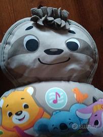 Cuscino gioco della Fisher price con suoni e vibrazioni nella tasca posta dietro, la testa del gioco (orsetto) ha della plastica che fa rumore per distrarre il bambino e gioco in plastica laterale. Nuovo mai usato.