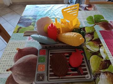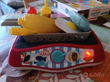gioco bambini Friggi friggi utilizzati due o tre volte praticamente è nuovo , ci sono anche pezzi in più , funziona con batterie va caricata con acqua e quando viene premuto il pulsante si sente un rumore come si frittura e l acqua incomincia a fare piccole bolle come quando friggiamo .