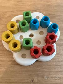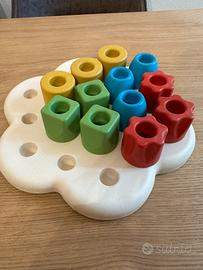 Set di blocchi colorati in legno per bambini, con forme diverse.