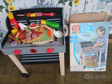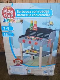Barbecue con ruote tutto in legno, facile montaggio misura cm46,5x59,5x34, 36 pezzi compresi accessori per alimenti, come Nuovo con scatola originale, fascia di età 2 - 8 anni. Posso spedire, 7/8 € con pacco tracciabile di Poste, Pagamento diretto con Bonifico. Anche contatti whatsapp al 3385923596.