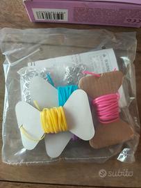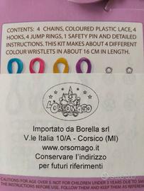 Contiene 4 catene, lacci in plastica colorata, 4 ganci, 4 anelli , 1 spilla da balia e istruzioni dettagliate