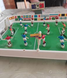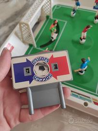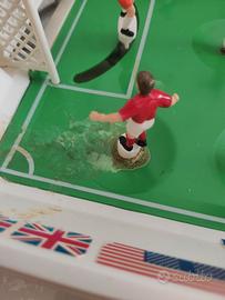 Gioco da tavolo "Calcio da tavolo, sfida i tuoi amici" - Gioca di più, Gioca DAG. La scatola è un po' graffiata, in quanto è un gioco vintage, ma è intera. Nel campo manca una bandierina e quella che c'è è attaccata con lo scotch all'asta. I calciatori sono fissati al campo con una molla che permette loro di muoversi, solo un giocatore è attaccato con la colla in quanto si era rotto (mostrato in foto), mentre i portieri possono essere spostati a destra e a sinistra. Ad un portiere manca una mano e la palla non è presente.