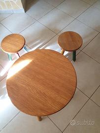 vendo tavolo con due sgabelli per bambini, tutto in legno, gambe colorate come da foto. Eventuale spedizione da calcolare.