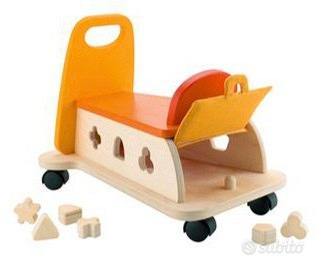 Gioco cavalcabile multidirezionale con 4 ruote in legno con contenitore integrato.