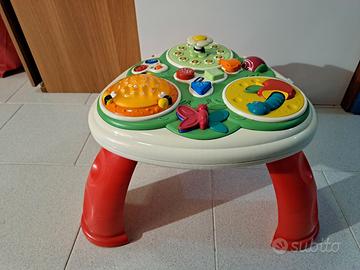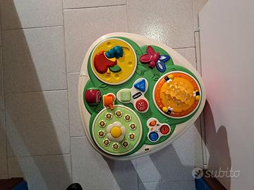 Gioco Chicco "Tavolo giardino delle parole", in forma di tavolino a tre gambe, funzionante a pile, bilingue (italiano, inglese), unisex, per bimbi 12-24 mesi (Codice 60083), funzionante e in buone condizioni; misure: larghezza 45 cm, gambe alte 27 cm; ubicazione San Donato Milanese (MI)
