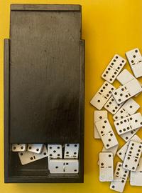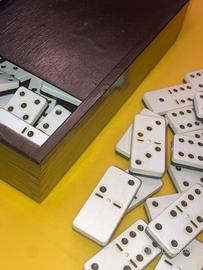 Gioco da tavolo Domino, divertente e adatto per ragazzi di qualsiasi età ma anche adulti. Interessante anche per fare shooting particolari in stile vintage. Confezione scatola in legno nero. Consegna a mano su Milano. Non si accettano resi.