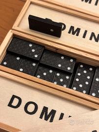 Gioco tradizionale di Domino: 28 pezzi neri più scatola di legno e coperchio scorrevole.