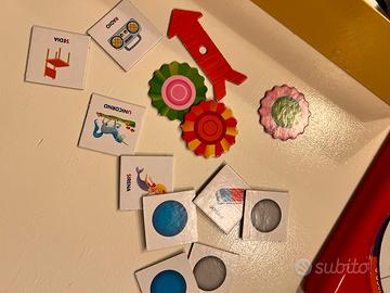 Gioco da tavolo il Cercatrova, è un gioco a tempo per trovare più carte possibili della tipologia indicata sulla ruota girevole, ci sono vari argomenti, animali, mestieri, cibi, lettere, colori, ecc. alcune categorie hanno meno carte delle altre, preciso che le tesserine di ogni categoria non sono tutte in equal numero, non posso dire se ne manca qualcuna ma ciò non influisce sul gioco, le coccarde vanno al vincitore di ogni partita, è in ottime condizioni l’unica cosa è che manca il piccolo buzz ma si può sostituire con un piccola clessidra o un qualsiasi timer