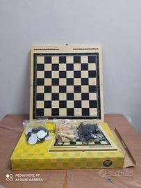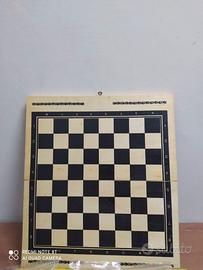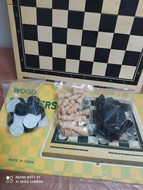 gioco dama e scacchi composto da: scacchiera in legno con funzione contenitore per le pedine e pedine in plastica. Altezza 5 cm, larghezza 23 cm, lunghezza 40 cm.