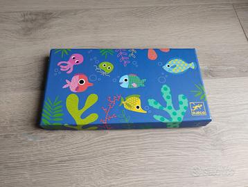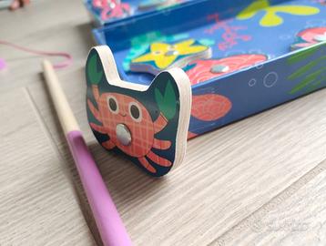 Questo gioco della pesca è dotato di 2 canne con amo magnetico e 12 pesciolini magnetici colorati.