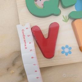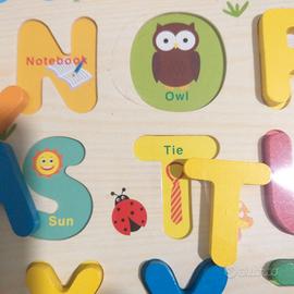 Lettere dell'alfabeto in legno con immagine in lingua inglese per imparare le parole in italiano e in inglese. Le dimensioni delle lettere sono lunghezza 4,5 cm larghezza cm 4,0 circa. La dimensione del supporto del gioco è 30 cm x 30 cm. Mai usato. Integro nella sua confezione.