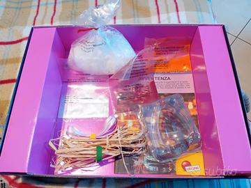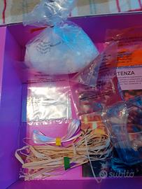 Contenuto della scatola: stampo per candele, paraffina, paglia e nastro colorato, coloranti alimentari arancione e rosso, manuale illustrato.