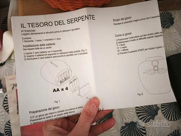 Gioco Il tesoro del serpente come nuovo prezzo di vendita in negozio 49.00. Un gioco da fare da soli o in gruppo, lo scopo è riuscire a rubare il preziosissimo smeraldo senza che il serpente guardiano se ne accorga. Bisogna avvicinarsi con cautela alla cesta e muoversi solo quando gli occhi sono verdi: se diventano rossi, infatti, il serpente salta fuori e il giocatore perde. Come nuovo