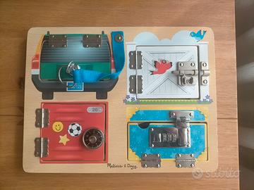 Tavola in legno con serrature e chiavistello adatto a bambini di età 3+, marca Melissa e Doug. In ottime condizioni e mai usato.