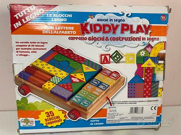 Gioco interamente in legno. Carrello con 35 blocchi di varie forme per costruire. 12 cubi con lettere e disegni. Usato ma perfettamente conservato. Scatola un po’ rovinata.