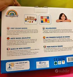 Un innovativo set di cubi colorati e naturali di varie forme, alcuni hanno anche perline all'interno e quindi funzionano come sonagli! Imballato in una scatola di legno