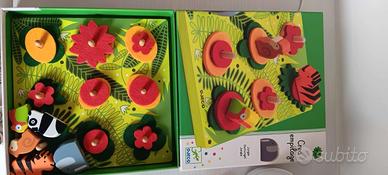 Gioco ben conservato, tabellone in legno e personaggi colorati sempre in legno. Ricrea l'ambiente impilando gli animali anche sopra le foglie.