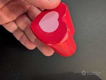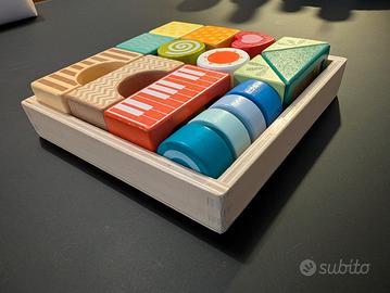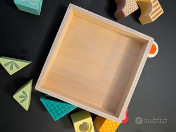 Giocattolo in legno composto da vari pezzi con diverse caratteristiche (specchio, sonaglino, stroboscopio, ecc.) insieme al loro vassoio per tenerli in ordine ed incastrarli nel modo corretto.