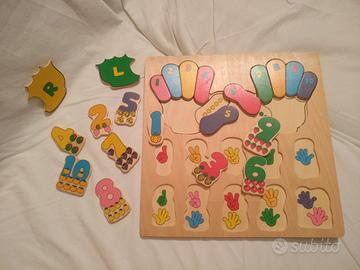 Vendo gioco didattico interamente fatto in legno. Si compone di tavola in legno con pezzi intarsiati ad incastro. Si apprendono i numeri, la differenza tra mano destra e sinistra. Colorato atossico e nuovissimo. Adatto a bimbi dai 3 ai 6 anni.