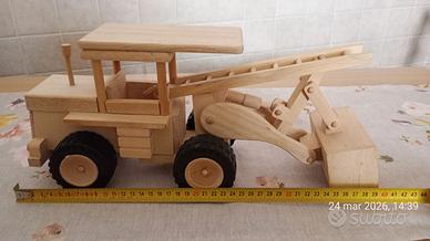 Trattore con scavatrice e scala di ottima qualità, completamente in legno non verniciato, nuovo