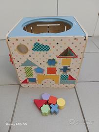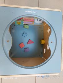 Gioco in legno con forme e altri giochi. manca un pannello. Presenti formine.