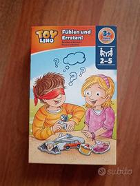 Con gli occhi bendati il bambino tocca la tesserina e dalla forma deve indovinare l'oggetto. Questa è la scatola in tedesco, ma vi sono le istruzioni in italiano e il gioco non ha parole quindi la lingua non ha importanza.