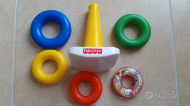 La Piramide 5 Anelli di Fisher-Price è un colorato classico. I bambini più piccoli non vedranno l'ora di afferrare, tenere in mano, scuotere e scoprire i cinque anelli colorati. L'anello più piccolo ha una superficie luccicante che riflette il contenuto: pieno di palline colorate che producono divertenti suoni tintinnanti. Quando il bambino saprà stare seduto eretto da solo, potrà inserire tutti gli anelli nella colonnina e far dondolare avanti e indietro la base oscillante. Impilare gli anelli favorisce la coordinazione manuale-visiva e introduce il concetto di grandezza relativa, mentre il bambino impara a distinguere il più grande dal più piccolo.