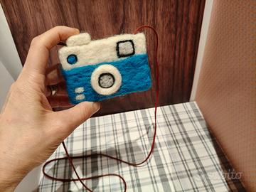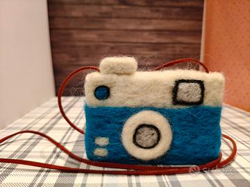 Macchina fotografica gioco in lana cardata.Posso realizzarla in qualsiasi colore come oggetto da portare a tracolla , come portachiavi, da attaccare allo zaino, ai jeans