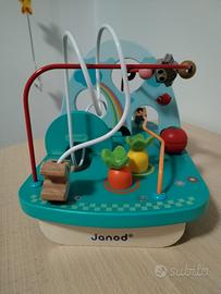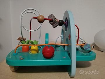 È dotato di3 fili con perle a forma di coniglio, civetta, tartaruga e nuvolache scorrono attraverso la montagna. Il piano presenta2 caroteda incastrare e unpomodoroimpilabile per sviluppare manualità e abilità fino-motorie.