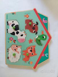 Simpatico gioco montessoriano che stimola la precisione manuale del bambino/a. Suona emettendo il verso dell'animale corrispettivo al corretto posaggio. Adatto da 9 mesi circa 3 anni. In legno. 5€