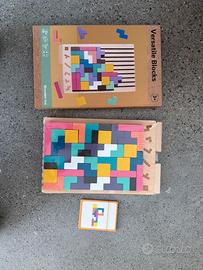 Il prodotto mostrato nell'immagine è un set di blocchi da costruzione in legno chiamato "Versatile Blocks", simile a un puzzle 3D o a un gioco di tipo Tetris. È un giocattolo educativo che aiuta a sviluppare la logica, la concentrazione e la motricità fine.