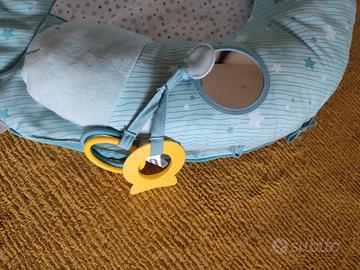 Palestra evolutiva con cuscino, musica e luce che consente il relax durante il giorno in 3 posizioni di riposo 4 configurazioni, basate sulle fasce d'età: 0m+ comodo nido; 2m+ testa sul cuscino con collo ben esteso; 4m+ posizione prona; 4m+ supporto per la posizione seduta Lunghezza regolabile in base alle dimensioni del bambino 30 minuti di musica classica Effetto luce delicato e vivace, a seconda del ritmo della musica Sia il cuscino che il tappeto sono lavabili in lavatrice Usato pochissimo. Sprovvisto della confezione originale.