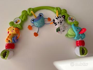 Gioco Fisher Price da agganciare a seggiolino o passeggino con anelli da girare, pupazzi che penzolano e suonano e altri giochini