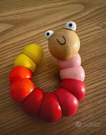 Piccolo lombrico in legno con sfere tattili a costituirne il corpo per un'esperienza tattile e sensoriale.