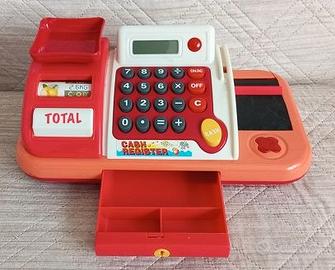 Registratore di cassa con tastiera funzionante a batterie (non incluse) il cassetto porta soldi si apre e si può chiudere a chiave. Il set è completo di cestino con frutta e verdura, banconote, monete e carta di credito.