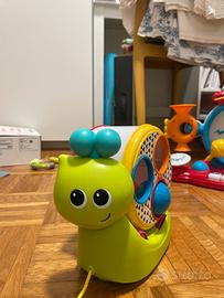 Gioco sonoro perché è un tamburo e logica il bambino deve capire come inserire le palline e toglierle poi la lumaca può camminare