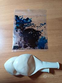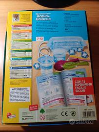Gioco Lisciani "Sperimenta con acqua e ghiaccio". Contenuto confezione (visibile anche nella 5ª foto): bicchiere graduato, bacinelle trasparenti, vaschetta, cannucce, tubicino di gomma, colorante blu, palloncini. Palloncini non originali, colorante blu parzialmente secco.