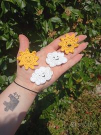 gioco da viaggio in cotone all'uncinetto con pedine fantasia nuvole e soli, il sacchetto ha chiusura a bottoni con bottoni a forma di pedina adorabili (ad incastro).