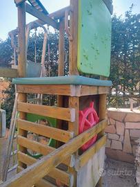 Giostra composta da arrampicate, scivolo (da sostituire finale, rotto vedi foto) arrampiacte, 2 altalene, trapezio, vedetta, timone, altalena e cesta altalenante (solo quella pagata 120 euro) causa inutilizzo che ne sta comportando lo scolorimento al sole, vendo.