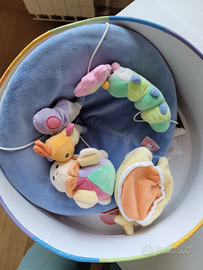 Morbidissima giostrina di peluche da appendere sulla culla, colori tenui, con appesi quattro animaletti ed un portaciuccio, completa di bella scatola originale perfetta anche da regalare.