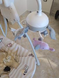 La giostrina può essere utilizzata sia a corrente che a batterie (già incluse). La seduta oscilla a varie velocità in avanti e indietro. Ha varie funzioni: lucine display, musichette varie, verso degli uccellini, suono dello scorrere dell'acqua, del vento con volume e velocità regolabile. Manca la pettorina ma i ganci sono gli originali (basta far cucire vicino ai ganci due tracolle visto che non manca nessun attacco di sicurezza). Nella foto ho numerato i supporti così da poter rimontare il tutto facilmente. Tutti i peluche sono integri.Peso supporto max 15 kg.