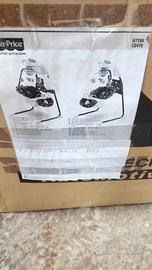 Alimentata a pile dondola il bambino con diverse intensità, il carillon in alto gira e si illumina con diverse melodie, si richiude facilmente e può essere riposta in poco spazio.