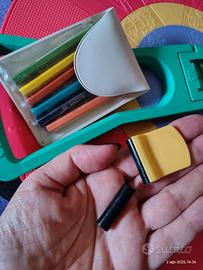Il famoso gioco "gira la moda" originale vintage 1987. In ottimo stato, la ruota colorata in plastica è perfetta, completo anche di ben due carboncini integri e originali e astuccio piccolo con matite. La scatola presenta solo piccoli segni del tempo ma non rotture, il supporto azzurro ha qualche segno di usura sui bordi.