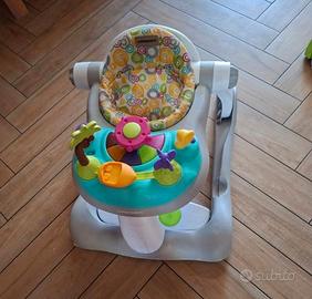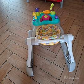 Dotata di un ampio vassoio portavivande con gioco musicale amovibile. Chiudibile, regolabile in altezza con dispositivo di sicurezza che lo blocca in prossimità di scale o gradin i4 ruote di cui 2 piroettanti e 2 gommate....Pedana musicale regolabile purtroppo non funziona ma si puo sistemare...