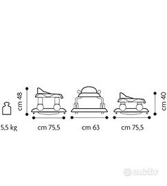 Funziona centro-attività grazie ai piedi a scomparsa, funzione dondolo e funzione girello con 3 possibilità di altezza.